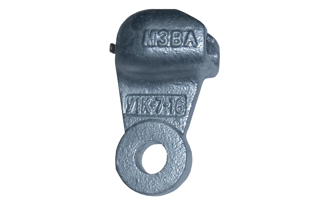Для соединения стержня подвесного изолятора или серьги, при комплектовании изолирующей подвески, применяют ушки У1 и У1К. Размеры гнезда сферического шарнирного соединения ушек соответствуют требованиям ГОСТ 27396. Двухлапчатая проушина ушек, присоединяемая к арматуре, выполнена в соответствии с требованиями ГОСТ 11359. Для предотвращения разъединения стержня изолятора или стержня серьги ушки комплектуются W- образными замкам, выполненными по ГОСТ Р 51178. Ушки У1К имеет меньший габаритный размер чем ушки У1. Ушки У1К применяются в изолирующих подвесках и траверсах креплений без защитной арматуры. Их применение сокращает длину и массу подвески. Изготавливаются из конструкционной высокомарочной стали, которая обеспечивает высокие прочностные характеристики. В целях коррозионной защиты ушки покрываются горячим цинком по ГОСТ 9.307 или термодиффузионным цинкованием по ГОСТ Р 9.316. Изготавливаются по ТУ 3449-001-52819896-2010.